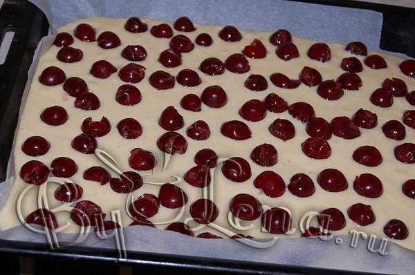Сверху уложить вишню и поставить пирог в духовку выпекаться при 180 градусах, 15-20 минут.